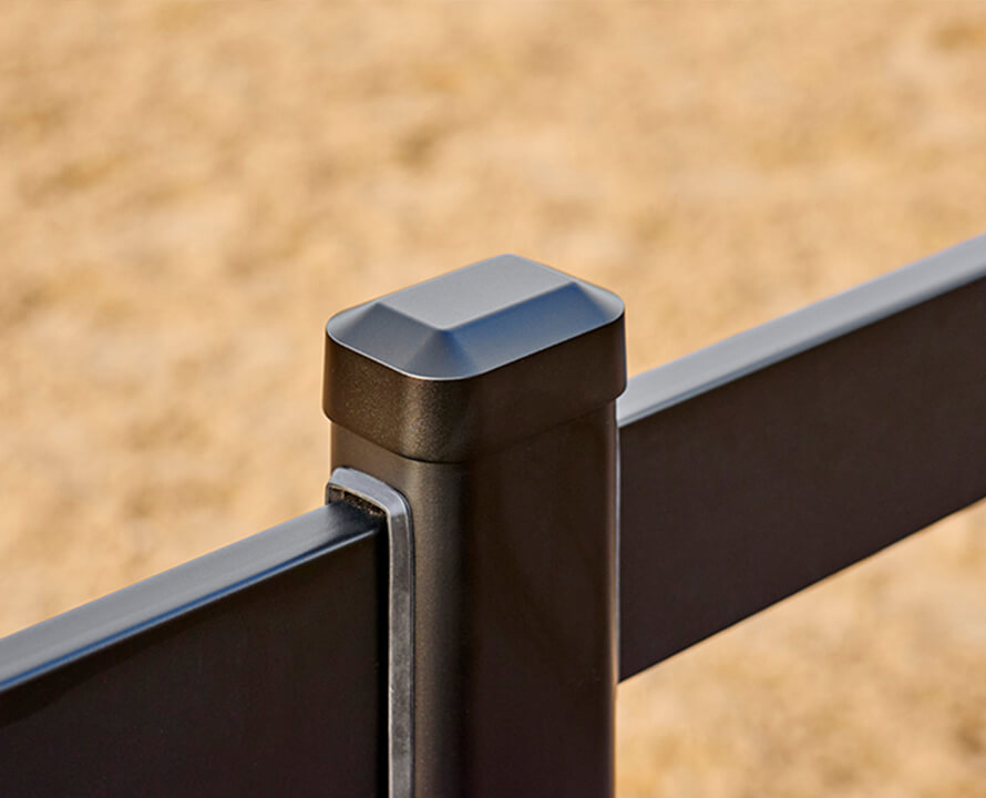 De moderne, rechthoekige palen met karakteristieke diamantenkop geven de omheining een exclusieve uitstraling, terwijl de liggers zorgen voor een klassieke, houtachtige look. Dankzij het slimme montagesysteem zonder schroeven of spijkers, gecombineerd met rubberen beschermringen en vergrendelende afstandhouders, zijn zowel strakke lijnen als organische vormen eenvoudig te realiseren. De gladde afwerking, afgeronde vormen en het ontbreken van uitstekende delen maken deze omheining niet alleen robuust en onderhoudsarm, maar ook bijzonder veilig en esthetisch verfijnd.