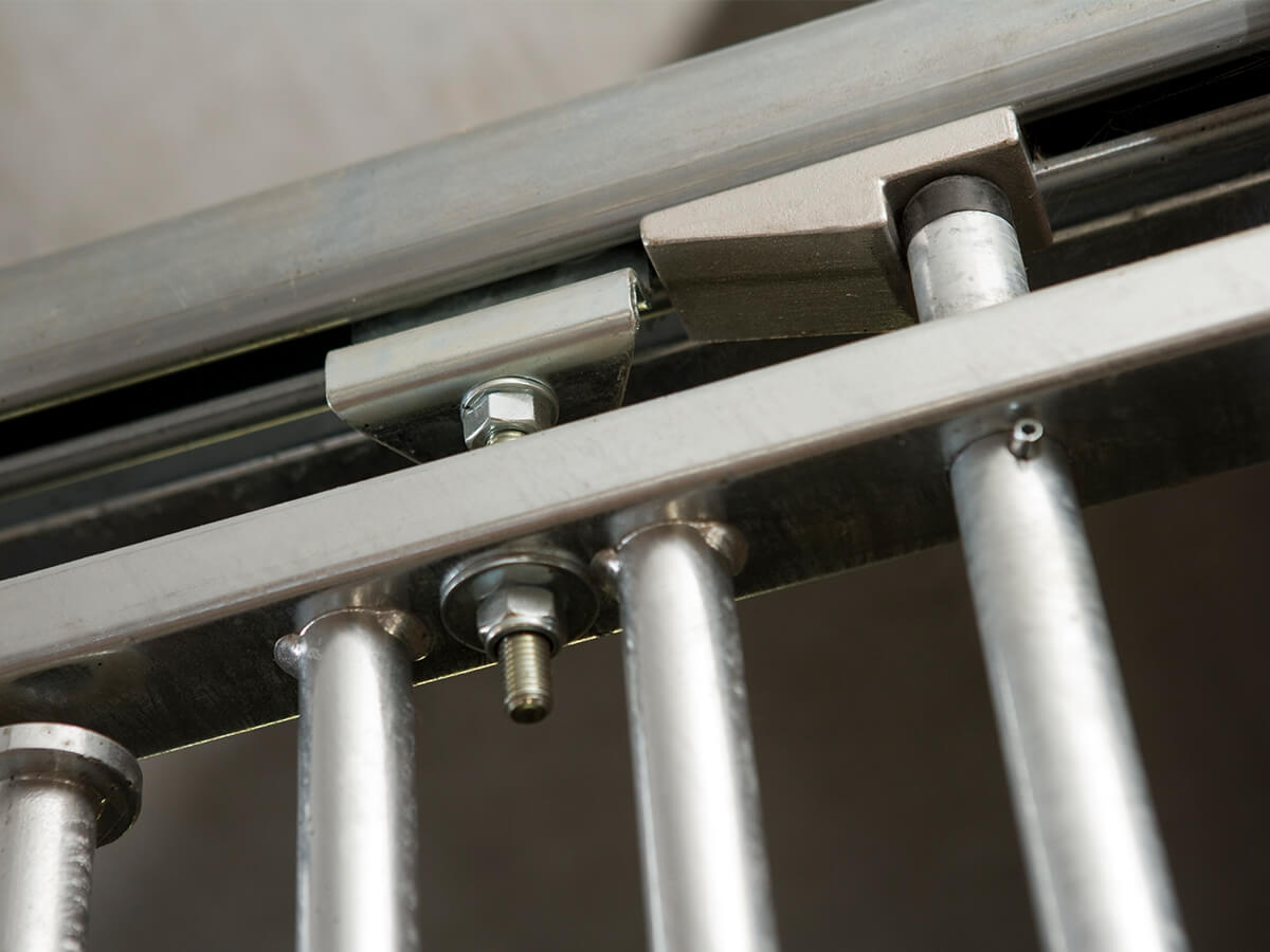 Dankzij de schuifdeur (links of rechts) met automatische spijlvergrendeling biedt de Duke-voorwand optimaal werkcomfort. De deuropening is uitgerust met een doorlopend stalen frame en door het profiel heen gelaste spijlen, wat zorgt voor extra stabiliteit en langdurige stevigheid. De schuifdeur is standaard voorzien van een opening, maar kan ook geleverd worden met een mini-deur of geheel gesloten met spijlen.